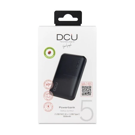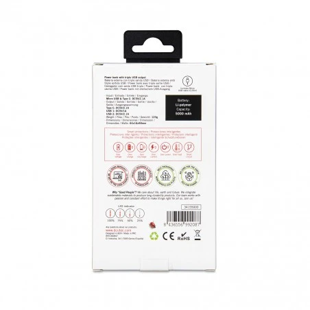 Batería externa con triple puerto USB (total 5V/2.1A) que permite cargar 3 dispositivos móviles al mismo tiempo.
