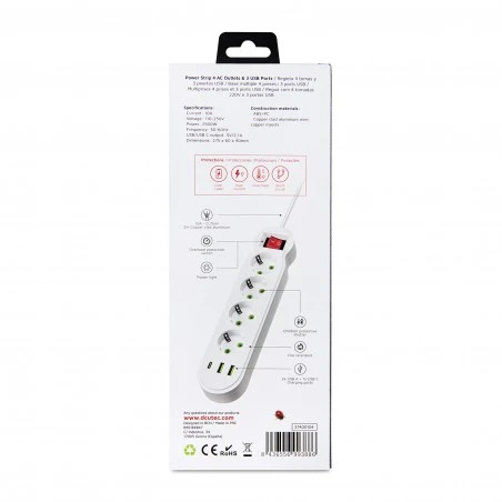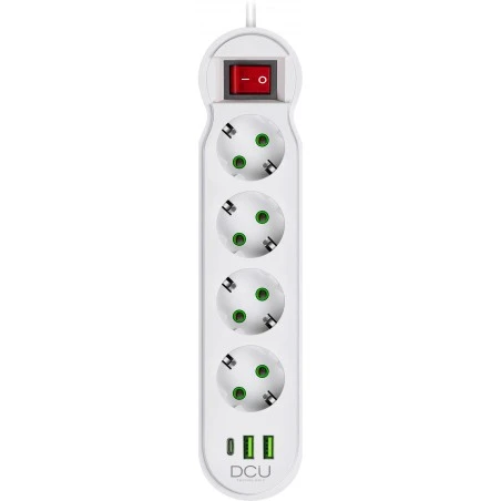 Regleta con 4 tomas de corriente a tierra 10A | 2500W en 45º para evitar interferencia entre las tomas, 2 puertos USB A y 1 puerto USB C con salida de 5V/2.1A